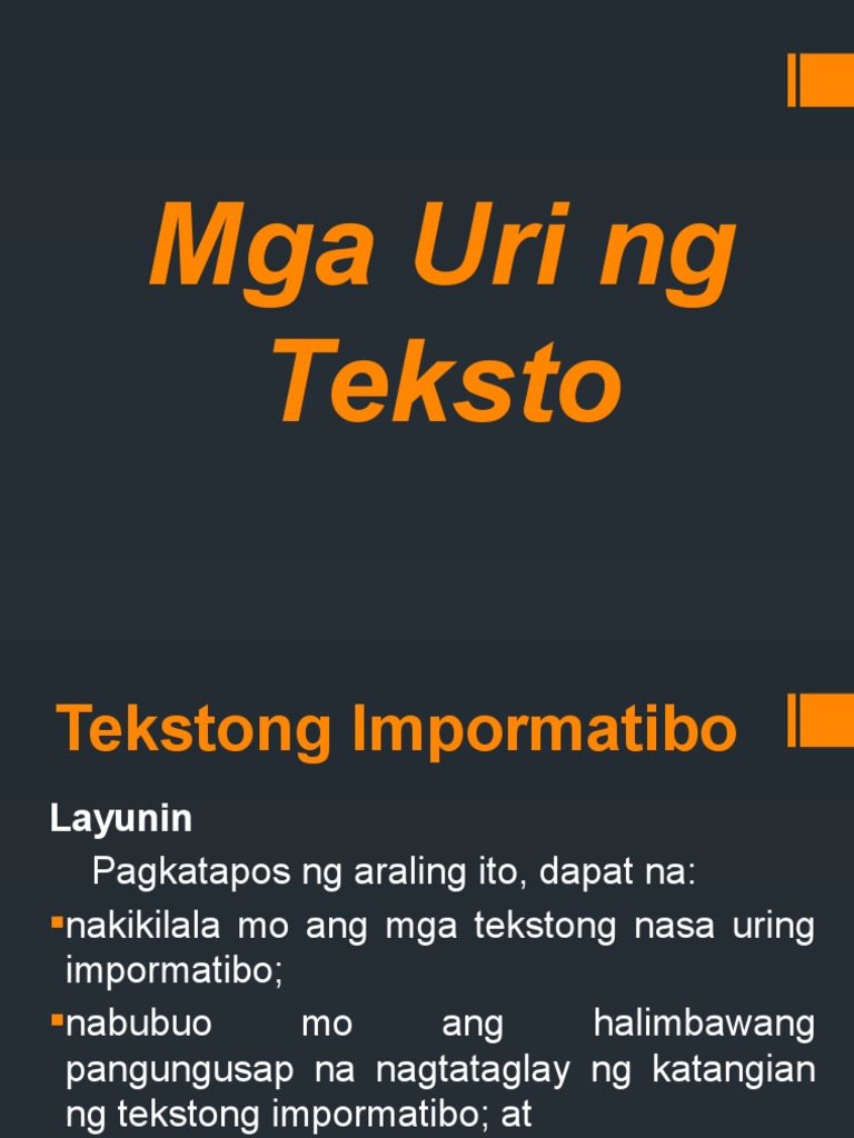 Tingnan sa susunod na pahina ang mga halimbawa ng tekstong prosidyural. 30012021 HALIMBAWA NG TEKSTONG IMPORMATIBO Sa paksang ito tatalkayin natin kung ano nga ba ang tekstong impormatibo.